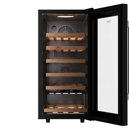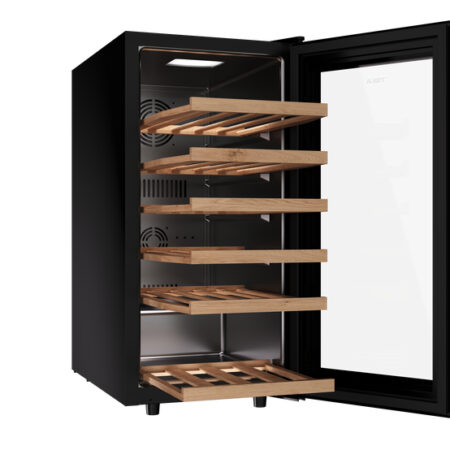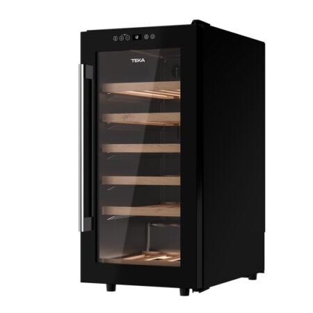 Teka RVF 10032 GBK. Apparaatplaatsing: Vrijstaand, Kleur behuizing: Zwart, Inwendige kleur: Zwart. Flessen-capaciteit: 32 fles(sen), Type product: Thermo-elektrische wijnkoeler, Klimaatklasse: SN-ST. Energie-efficiëntieklasse: F, Jaarlijks energieverbruik: 89 kWu, Energie-efficiëntieschaal: A tot G. Soort bediening: Knoppen, Soort lamp: LED. Breedte: 380 mm, Diepte: 585 mm, Hoogte: 767 mm